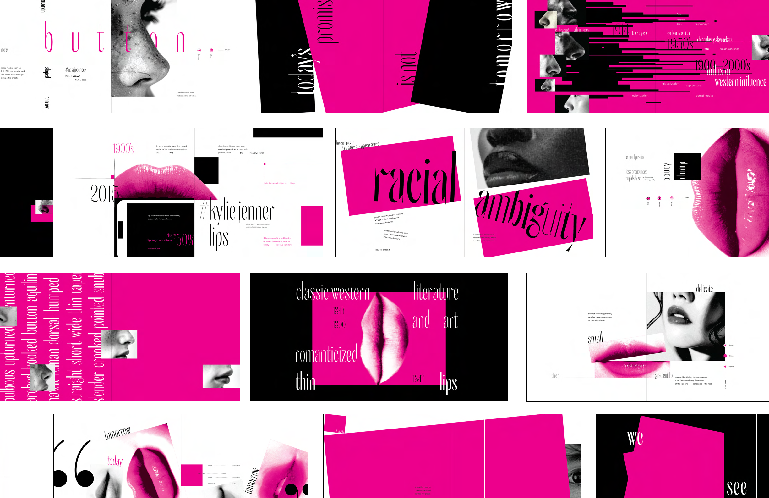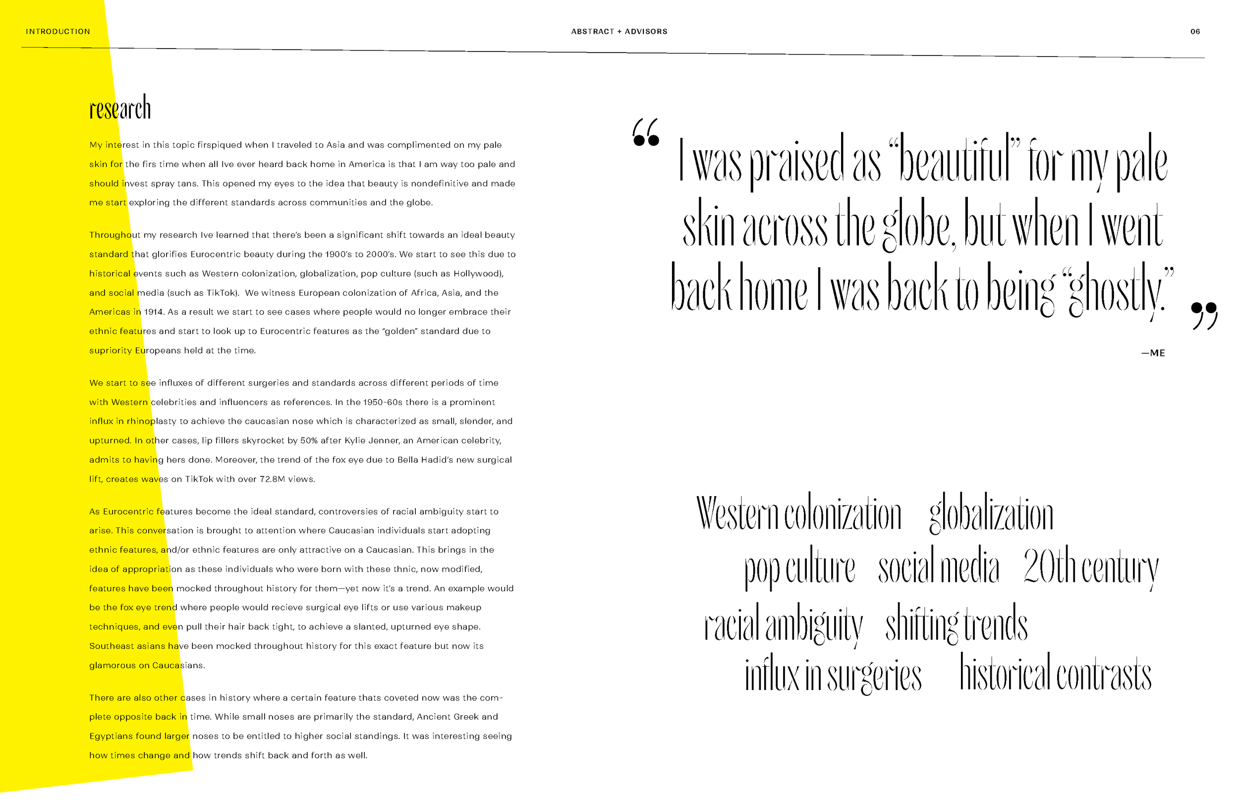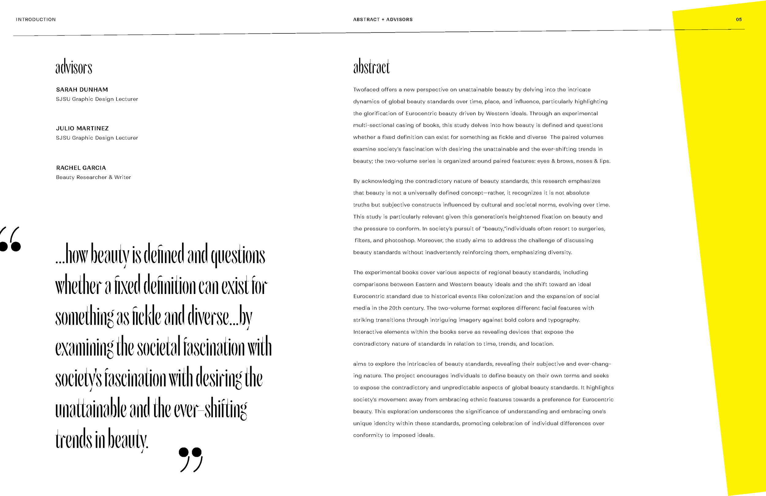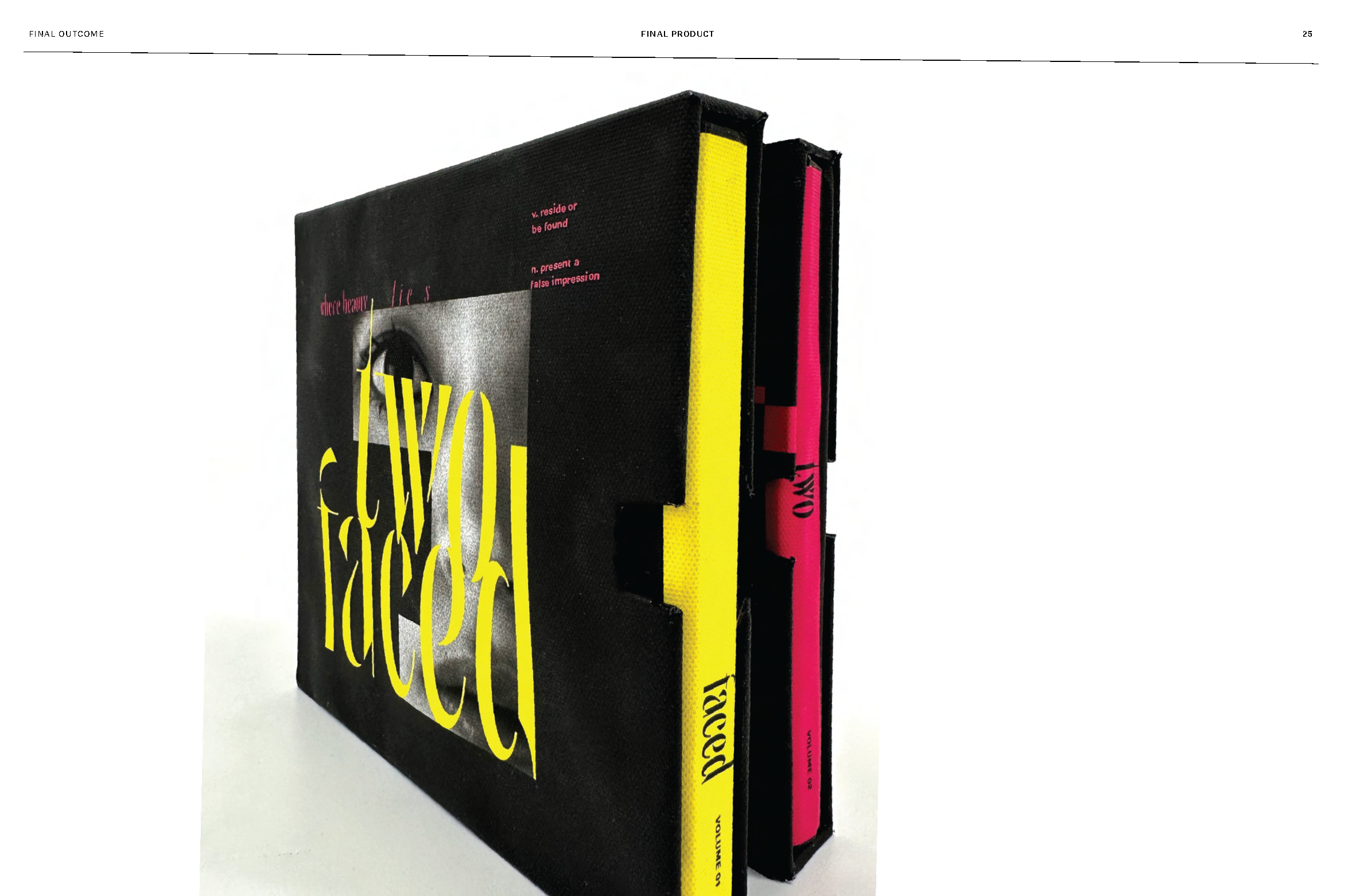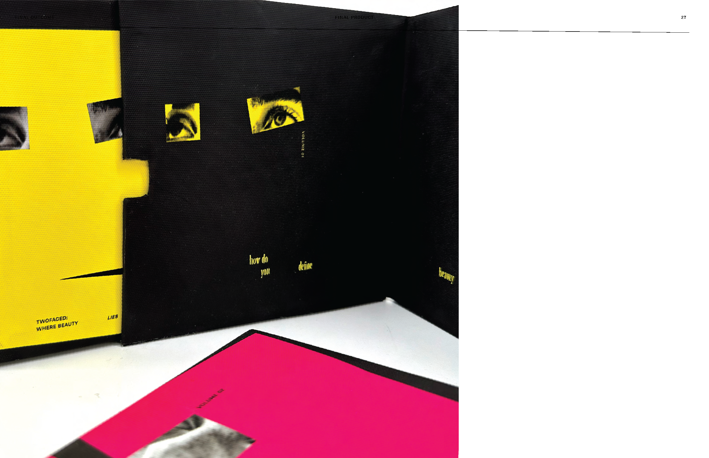 Two-Faced: Where Beauty Lies, is a thesis project that delves into the dynamic evolution and conflicting nature of global beauty standards throughout history, geography, and cultural influences, with an emphasis on the effects of Eurocentric ideals driven by Western influence on perceptions of beauty. Through an experimental multi-sectional casing of books, this study delves into how beauty is defined and questions whether a fixed definition can exist for something as fickle and diverse.